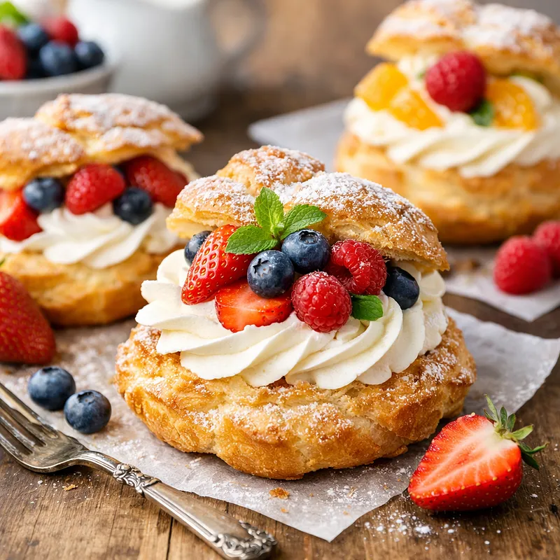 Choux pastry was created in France in the 17th century; its unique feature is the high moisture content during baking, which turns into steam and creates a hollow, light structure — perfect for filling. In Poland, cream puffs were a popular homemade dessert as early as the 20th century and often feature seasonal fruits.