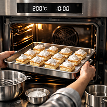 Place the tray in the preheated oven at 200°C and bake for 10 minutes. After 10 minutes, reduce the temperature to 180°C and bake for another 15-20 minutes, until the cream puffs are evenly golden and clearly risen. Do not open the oven in the first 15 minutes — a sudden drop in temperature may cause the cream puffs to collapse. Once baked, turn off the oven and slightly crack the door for 5 minutes, then remove the cream puffs and cool on a rack.