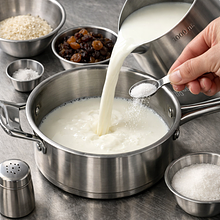 When the milk starts to gently boil, add the rinsed rice and immediately reduce the heat to low (small flame). Stir vigorously for the first minute to prevent the rice from sticking, then stir every 2–3 minutes for about 18–20 minutes. Cook covered with a translucent lid (or slightly ajar) – a thick cream should form. Check for softness: the grain should be soft in the center but retain its shape; the liquid will be thick and coat the grains.