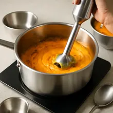 Remove the pot from the heat and wait 1 minute. Blend the mixture into a smooth puree: use an immersion blender (most convenient) and blend with up-and-down motions until you achieve a uniform, creamy consistency (this will take 1-2 minutes). Alternatively, you can use a countertop blender: add the mixture in batches to the jar and blend each batch for 30-60 seconds. If the consistency is too thick, add 1-2 tablespoons (15-30 ml) of broth or water and continue blending until you reach the desired effect — the puree should be creamy but not watery.