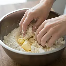 Using only your fingertips, quickly and vigorously rub the butter with the flour and sugar. Make movements as if you were 'pinching' the ingredients. Continue until clumps resembling wet sand and small crumbs form. Do not knead for too long to prevent the butter from melting. Place the finished crumble in the refrigerator while preparing the rest of the dough.