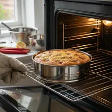 Place the cake in the preheated oven and bake for 50-60 minutes. After about 40 minutes, check if the top is browning too much. If so, loosely cover it with a piece of aluminum foil. To check if the cake is done, insert a wooden skewer into the center. If it comes out dry (without traces of raw batter), the cake is baked.