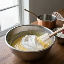 Now the most delicate stage: combining the mixtures. Add 1/3 of the whipped egg whites to the yolk mixture and mix vigorously to loosen it a bit. Then add the remaining foam in two batches, gently folding everything together with a large silicone spatula each time. Use sweeping motions from the bottom of the bowl upwards, rotating the bowl. Mix only until the ingredients are combined and no white streaks of foam are visible.