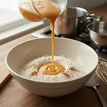 Prepare the dry ingredients. Take a large bowl and place a fine-mesh sieve on top. Pour the all-purpose flour, baking powder, cinnamon, and salt into the sieve. Sift all the ingredients into the bowl, gently tapping the side of the sieve. This will aerate the flour and combine the ingredients, ensuring the pancakes are light and preventing lumps from forming.