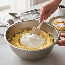 Gently fold in the egg white foam. Transfer 1/3 of the whipped egg whites to the cheese mixture and mix more vigorously to loosen it a bit. Then add the remaining egg whites and now mix very gently using a spatula. Make movements from the bottom of the bowl upwards, as if you were 'scooping' the batter onto the foam. Mix only until the ingredients are combined and no white streaks of foam are visible. The goal is to retain as much air in the batter as possible.