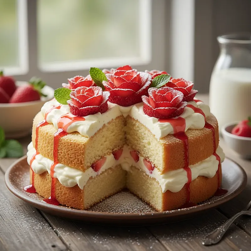 Here is the essence of summer captured in the form of a delicate cake. This recipe is a tribute to the classic in a modern, light version. Imagine an incredibly fluffy, golden sponge cake that melts in your mouth, soaked in a gentle lemon syrup. Its heart is a velvety, vanilla whipped cream, stabilized with mascarpone cheese, creating the perfect white cloud. The whole is crowned with fresh, juicy strawberries, arranged in an intricate pattern reminiscent of a blooming rose. This cake is not only a feast for the palate but also for the eyes. Perfect for family celebrations, summer garden parties, or as a sweet reward after a hard week. Its preparation, step by step, will become a pleasure, and the final effect will delight everyone, even the most demanding gourmet.