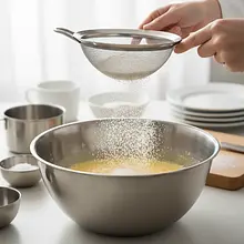 Start by preparing the ingredients and the baking pan. Take the eggs out of the fridge about 30 minutes before you begin, so they reach room temperature. Line the bottom of a 24 cm springform pan with parchment paper - cut out a circle that fits perfectly. Do not grease the sides of the pan. Preheat the oven to 170°C (fan) or 180°C (top and bottom). In one bowl, combine and sift the all-purpose flour and potato flour. Set aside.