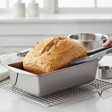 After 15 minutes, reduce the oven temperature to 200°C (without convection) or 180°C (with convection) and continue baking for another 30-35 minutes. The bread is ready when its top is deep golden-brown and the loaf slightly pulls away from the edges of the pan.
