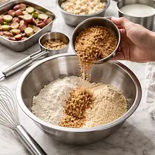 In a medium-sized bowl, place 150g of all-purpose flour, brown sugar, ground almonds, and optionally cinnamon. Add the very cold butter, cut into small cubes. Now for the most important part: using your fingertips, quickly rub the butter into the dry ingredients. Do this vigorously until clumps resembling wet sand form. Do not knead the dough for too long to prevent the butter from melting. Place the finished crumble in the refrigerator while preparing the dough.
