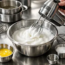 Skip the bowl with egg whites to a stand mixer or hand mixer. Whip the egg whites on low speed until small bubbles form (about 1–2 minutes). Gradually increase the speed to medium-high and add the remaining 50 g of sugar, one tablespoon at a time, whipping evenly. Continue whipping for about 3–5 minutes, until the meringue is glossy and forms stable, stiff peaks (the peak should hold when the whisk is lifted).
