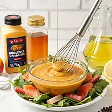 A light spring salad combining tart, slightly caramelized rhubarb with delicately salty smoked salmon on a bed of mixed greens and sorrel. The honey-mustard dressing blends sweetness with a sharp mustard note and the freshness of lemon, while sautéed asparagus and thin slices of red onion add structure and crunch. The dish has a modern fusion character — inspired by Polish flavors (rhubarb, sorrel, young asparagus) paired with classic smoked salmon. Serve as an appetizer or a light lunch, preferably on a large flat plate, garnished with fresh dill. Aesthetically: the contrast of the red rhubarb, pink salmon, and green greens creates a striking spring dish.
