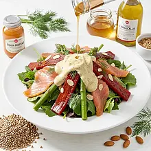 Drizzle the salad with the prepared honey-mustard dressing evenly — about 30–40 g of dressing for the whole salad (approximately 10 g per serving). Sprinkle the salad with chopped dill (10 g) and freshly ground pepper. If using, add toasted almond flakes (30 g) and/or roasted buckwheat (40 g) for crunch. Serve immediately so that the rhubarb is slightly warm and contrasts with the cool salmon.