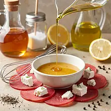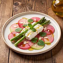 Wash the rhubarb under cold water and dry it with a paper towel. Cut off the woody ends (about 1–2 cm). If the skin is very fibrous, peel it thinly with a vegetable peeler — be careful not to peel too deeply. After cleaning, place the stalks on a cutting board and slice them into thin pieces at an angle (diagonally) about 1–2 mm thick; this will make the slices larger and more impressive. If you have a mandoline, set it to the thinnest setting and use a finger guard or protective glove.