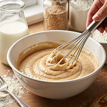 In a separate bowl, whisk the eggs with the milk using a whisk or a mixer on low speed for 20–30 seconds until the mixture is smooth. Pour the wet ingredients into the dry ingredients and mix with a spoon or whisk just until combined — the batter should be thick, not completely liquid; the consistency should be similar to thick cream. If the batter is too thick, add 1–2 tablespoons of milk.