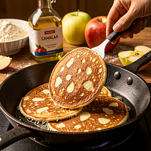 Apple pancakes are a classic Polish homemade dessert — fluffy, delicate fritters with pieces of apple inside, fried to a golden brown. They originate from peasant cuisine as a quick and filling dish for breakfast or a snack. In the traditional version, the batter is thicker than pancake batter, slightly sweet, with distinct pieces of apple; served dusted with powdered sugar or cinnamon, they look appetizing and smell cozy. They taste best fresh, still warm, with tart-sweet apples like gray renet or ligol. They can be served with sour cream, natural yogurt, or fruit jam as a flavor contrast.