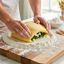 Prepare a mound of flour on a large countertop: sift the flour onto a clean surface, form a heap, and create a deep well in the center (like a crater). Crack 240 g of eggs (4 pieces — leave one for later for the filling) into the well. Start mixing with a fork from the inside, slowly pulling the flour from the sides into the center until a thick paste forms. When the mixture becomes too dense, use your hands to gather the flour so that the entire egg is absorbed. Knead the dough vigorously for 8-10 minutes until it is smooth, elastic, and no longer sticky to your hands. If it is sticky, add 10 g of flour at a time; if too dry, moisten your hands with a little water.