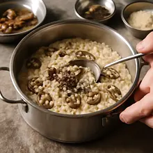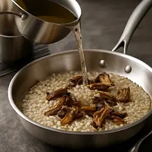 Start adding hot broth one ladle at a time (about 100–150 ml at a time). After adding the first ladle, stir vigorously with a wooden spoon until the rice absorbs the liquid (this takes 1–2 minutes), then add another ladle. Repeat this process consistently for 18–22 minutes — the rice should be soft on the outside and slightly firm in the center (al dente), and the consistency should be creamy and slightly runny.
