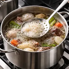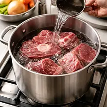 When the water starts to boil, foam (scum) will appear on the surface. Use a slotted spoon or a sieve to regularly (every few minutes for the first 10–15 minutes) collect the foam and impurities until the broth is clearer.