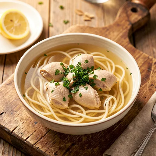 Separate the meat from the bones: tear or cut the breasts and thighs into pieces, remove the skin and tendons. Heat the boiled, strained broth and taste — season with salt to taste. Place a portion of pasta in a bowl, add pieces of meat, and pour hot broth over it. Generously sprinkle with finely chopped parsley. Optionally, add a pinch of dried lovage (first try 1/4 teaspoon) and serve a slice of lemon on the side.