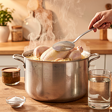 After cooking, remove the chicken and set it aside on a cutting board to cool. Strain the broth through a fine sieve or a thick sieve lined with cheesecloth into another pot to get rid of any bits and impurities. If you want a clearer broth, chill the stock in the refrigerator for 1–2 hours and remove the solidified fat from the surface.