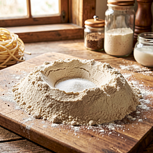 On a pastry board or in a large bowl, sift the flour and form a mound. Make a well in the center (like a crater) and crack in the whole eggs. Add about 1 g of salt (part of the total amount). With a fork or your fingers, gently combine the eggs with the flour from the inside, gradually pulling in the flour from the sides until an uneven dough forms. Then, start kneading by hand for 8–10 minutes until the dough is smooth, elastic, and no longer sticks to your hands. If the dough is too dry, add a little cold water; if too sticky, sprinkle a thin layer of flour.