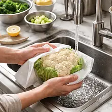 Prepare the cauliflower: wash the head under cold running water and dry it with a paper towel. Place the cauliflower on a cutting board with the base facing down. Using a sharp knife, remove the lower leaves and trim the short part of the stem so that the cauliflower can stand upright; do not cut off the entire stem — we want the head to remain intact. Then, carefully score the cauliflower in a 'rose' shape: make vertical cuts every 1.5–2 cm, not cutting all the way to the bottom (about 1–2 cm from the base), so that the head retains its shape. The cuts should reach about 80% of the height of the head — check that the cauliflower still holds together when lifted.