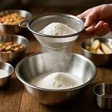 In a separate bowl, sift 300 g of flour with 12 g of baking powder and 3 g of salt. Add the dry ingredients to the wet ingredients in batches and mix with a spatula just until there are no visible dry patches of flour — do not mix too long to avoid making the dough tough.