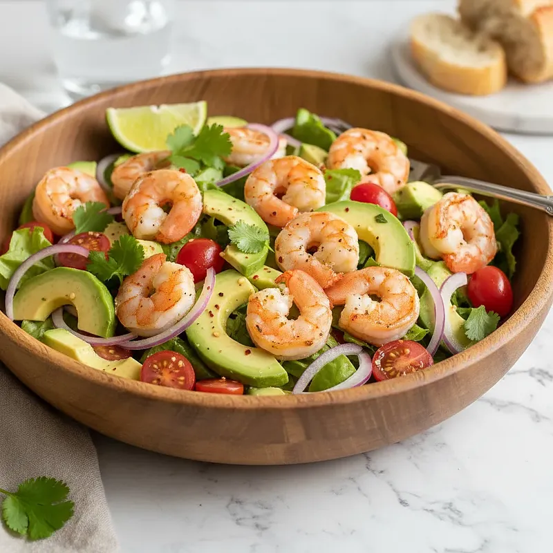 Ta sałatka najlepiej smakuje świeża i nie nadaje się do długiego przechowywania, zwłaszcza po wymieszaniu z sosem. Jeśli musisz przygotować ją wcześniej, przechowuj wszystkie składniki (warzywa, usmażone krewetki, sos) osobno w szczelnych pojemnikach w lodówce. Krewetki i warzywa do 24 godzin, sos do 3 dni. Awokado przygotuj i pokrój tuż przed podaniem.