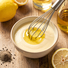 Prepare the dressing: squeeze the juice from half a lemon (about 20–30 ml) into a small bowl. Add 2 tablespoons of rapeseed oil (30 g) and 1 tablespoon of honey (15 g) if using. Add a pinch of salt and two pinches of pepper. Whisk vigorously with a whisk or fork for 30–60 seconds until the ingredients combine and a light emulsion forms. Taste and adjust with a bit more salt or lemon juice if needed.