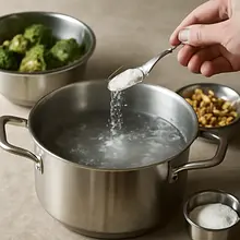 Bring at least 2 liters of water to a boil in a large pot. Add 10 g of salt (about 1 teaspoon) and wait for the water to reach a full boil. Place the prepared florets into the boiling water and blanch for 2-3 minutes — the broccoli should turn bright green and be tender-crisp (when pierced with a fork, it should give slight resistance but not be raw).
