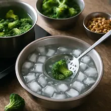 Prepare a bowl with plenty of cold water and ice cubes (an ice bath). After 2-3 minutes of blanching, drain the broccoli in a colander and immediately transfer it to the ice bath for about 2 minutes — this will stop the cooking process and preserve the vibrant green color. After cooling, drain and spread the broccoli on a clean cloth or paper towel, gently patting and drying the surface.