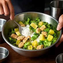 A light and refreshing salad with chicken and pineapple, perfect for the Christmas table. It combines the juiciness of pineapple with the delicate flavor of chicken, creating a harmonious blend of tastes.