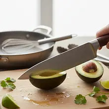 Teraz czas na awokado. Przekrój je wzdłuż na pół, obracając nóż wokół pestki. Chwyć połówki w obie dłonie i przekręć w przeciwnych kierunkach, aby je rozdzielić. Aby usunąć pestkę, wbij w nią ostrożnie ostrze noża i przekręć – pestka łatwo wyjdzie. Miąższ wyjmij za pomocą łyżki lub pokrój w skórce w kostkę i dopiero wtedy wyjmij. Pokrojone awokado od razu skrop odrobiną soku z limonki, aby nie ściemniało.