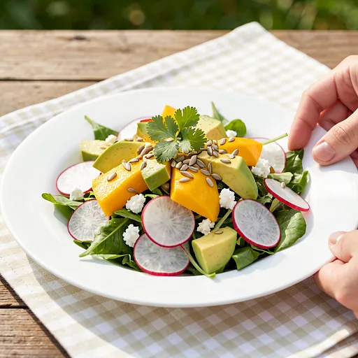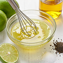 Prepare the dressing: squeeze the juice from the lime (cut the lime in half and squeeze it by hand or with a juicer for about 30 seconds), pour it into a small bowl. Add the rapeseed oil and honey. Whisk with a whisk or fork for 20-30 seconds until the ingredients combine and the dressing becomes smooth. Add 1 g of pepper and 2 g of salt, mix and taste — it should be distinctly tangy-sweet, slightly salty.