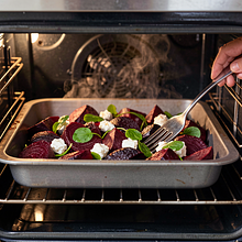 Place the tray in the preheated oven and bake for 30–35 minutes. After 20 minutes, turn the pieces with a spatula to ensure even browning. The beets are ready when a fork goes in easily (without resistance) and the edges are slightly caramelized.