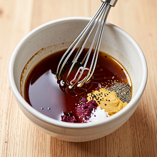 In a small bowl, combine balsamic vinegar (30 g), honey (30 g), and mustard (15 g). Whisk or use a fork to mix for about 30 seconds until the ingredients are combined. Slowly drizzle in the remaining olive oil (15 g) in a thin stream, whisking continuously until the dressing thickens and becomes silky. Season with 1 g of salt and 2 g of black pepper to taste — remember that feta is salty, so don't overdo it with the salt.