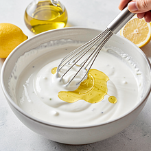 Pour 250 ml of natural yogurt into a medium bowl. Add 15 g of rapeseed oil and 15 g of lemon juice (freshly squeezed without seeds). Mix with a spoon or whisk for 20–30 seconds until the ingredients combine and the sauce becomes smooth and slightly glossy.