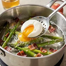 It is best to consume the salad immediately; if there are leftovers, store the grains and dressing separately in the fridge for up to 24 hours. The bacon can be stored in a separate container for up to 2 days. Poached eggs are not suitable for long storage; it is best to make them just before serving. Briefly heat the grains and asparagus in a pan before serving.