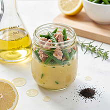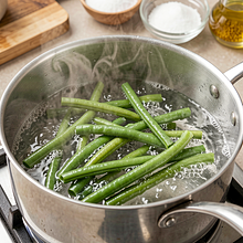 Prepare the green beans: rinse the green beans under cold water, trim the ends (about 3–5 mm from each side). In a large pot, bring 2 liters of water to a boil with a pinch of salt. Once the water is boiling, add the green beans and cook for 4–5 minutes – check from the 4th minute: the beans should be juicy and firm (easily pierced with a fork, but not overcooked).