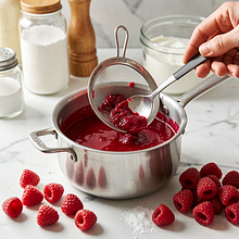 Prepare 6 small tartlet rings with a diameter of ~8 cm or one springform pan with a diameter of 20 cm. Also, prepare a container for melting butter, a blender or bowl and mixer, and a sieve for straining the raspberries.