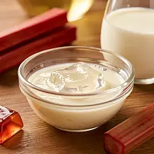 Prepare rhubarb compote: wash and dry 400 g of rhubarb, trim the ends, and cut into 1–2 cm pieces. Place the rhubarb in a saucepan, add 40 g of sugar and the juice of half a lemon (about 30 g of juice; you can also grate 1/2 teaspoon of zest if you want a more intense aroma). Heat over medium heat, stirring, until the rhubarb releases its juice and starts to break down — cook for 6–8 minutes. If you want a firmer compote, cook for an additional 1–2 minutes.