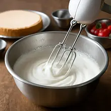 Whip the cream: pour 400 ml of chilled cream into a very cold bowl (preferably metal) and beat with a mixer on medium speed until soft peaks form. Towards the end of whipping, add 50 g of powdered sugar and 1 g of salt and continue to whip to medium-stiff peaks (about 2–3 minutes). The cream should hold its shape but not be overly sweet.