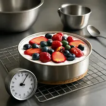 First, leave the cheesecake at room temperature for 20–30 minutes (to avoid thermal shock), then lightly cover it with plastic wrap and place it in the refrigerator for a minimum of 4–6 hours, ideally overnight (8–12 hours). Before serving, perform the side release: run a thin knife around the edge of the springform pan, loosen the ring, and remove the outer ring. Cut using a sharp knife dipped in hot water and dried between cuts to achieve clean slices.