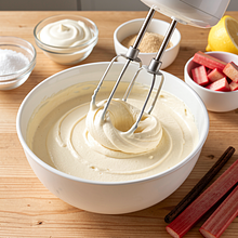 Prepare the rhubarb: trim the ends and cut into pieces about 2 cm long. Place the rhubarb in a small pot with 30 g of sugar (the remaining sugar from the list) and 1–2 tablespoons of water (15–30 ml). Cook over medium heat for 6–8 minutes, stirring, until the rhubarb softens, releases juice, but does not completely break down — it should be tart-sweet and juicy. If you are using strawberries (optional), add them at the end for 1–2 minutes to keep their shape.