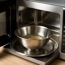 Gently heat the swollen gelatin: place the bowl in the microwave for a few seconds (10–15 s) or set the bowl over a pot of lightly boiling water (water bath) and stir until it becomes completely clear and liquid — do not let it boil. Set aside for 30–60 seconds so it is not hot.