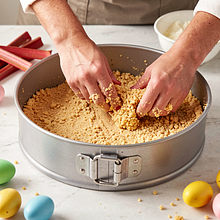 Place the biscuits in a large plastic bag and crush them with a rolling pin into fine crumbs (they should be small pieces, but not powder). If you prefer, pulse the biscuits in a food processor. Transfer the crushed biscuits to a bowl, add 100 g of melted, cooled butter and 25 g of flour. Mix with a spoon until the mixture resembles wet sand and slightly sticks together when squeezed in your hand.