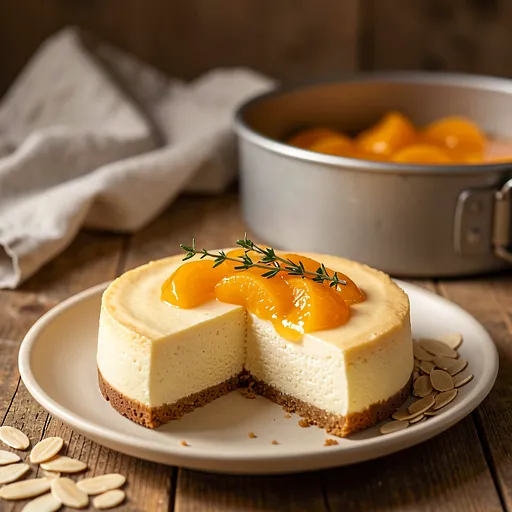 A delicate cheesecake with a creamy filling on a classic biscuit base, served with an aromatic thyme-lemon peach compote. This is a modern take on the Polish cheesecake: it is based on twaróg, but has a light creamy texture and a fresh, slightly tangy fruit accent. The cheesecake is perfect for family desserts and small gatherings; it looks impressive thanks to the glossy compote and almond flakes as an optional topping. Flavor profile: creamy, slightly tangy twaróg, sweetness of peaches, and herbal, fresh aroma of thyme. Visually: a golden base, creamy center, and a pink-golden compote on top.