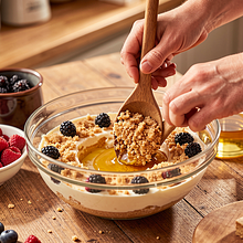 Przygotuj polewę: w rondelku umieść owoce leśne, 50 g cukru (z porcji) i łyżkę soku z cytryny. Podgrzewaj na średnim ogniu 6–8 minut aż owoce puszczą sok. Jeśli używasz mrożonych owoców, podgrzewaj 1–2 minuty dłużej. Do 2 łyżek zimnej wody dodaj pozostałą skrobię (jeśli potrzebna) i wlej do owoców, gotuj 1–2 minuty aż lekko zgęstnieje. Odstaw do lekkiego ostudzenia.