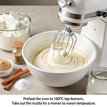 Rozgrzej piekarnik do 160°C (góra-dół). Wyjmij ricottę na moment, by była w temperaturze pokojowej. W dużej misce umieść ricottę i 2/3 cukru (100 g), cukier wanilinowy oraz szczyptę soli. Ubijaj mikserem na niskich obrotach przez 1–2 minuty aż masa stanie się gładka i kremowa.