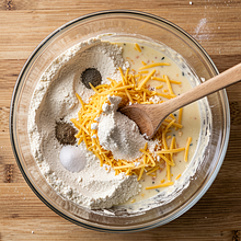 Prepare the dough for cheese pancakes. In a large bowl, sift the flour, add salt and pepper. Make a well in the center of the bowl. In a separate bowl, beat the eggs, pour in the milk, and mix with a fork. Pour the milk-egg mixture into the well and stir from the center to the edges until a smooth batter without lumps forms. Add grated cheese and mix until the cheese is evenly distributed in the batter. The batter should have the consistency of thick cream; if it is too thick, add 1-2 tablespoons of milk.
